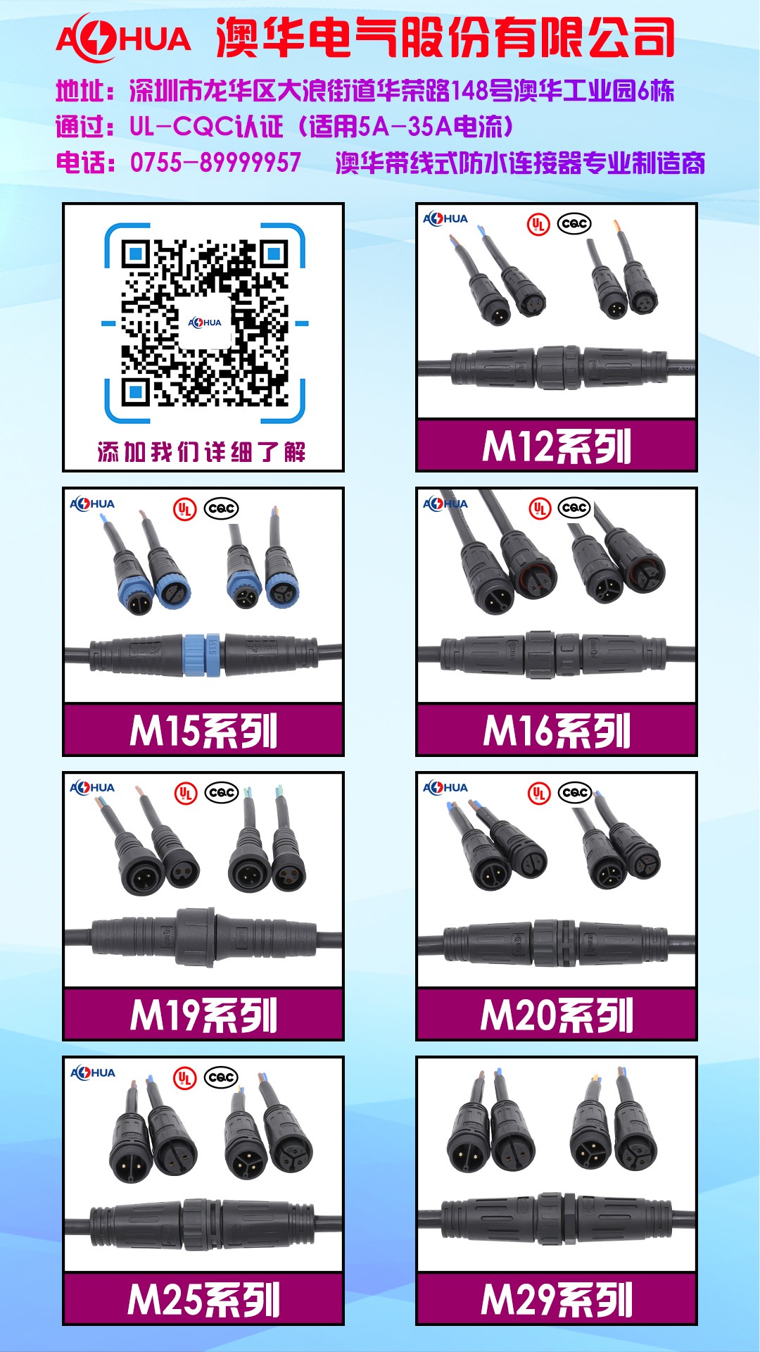 AHUA澳華公司專(zhuān)業(yè)生產(chǎn)LED防水插頭連接器、路燈模組分線盒、工控防水公母接頭、光伏航空插頭、新能源防水電源連接線、植物生長(zhǎng)燈連接線、畜牧養(yǎng)殖連接線、汽車(chē)線束。工廠自有模具制造、電線電纜押出、大型注塑、五金制造,雙生產(chǎn)基地,可來(lái)圖來(lái)樣個(gè)性化定制,國(guó)家高新技術(shù)規(guī)模企業(yè)!