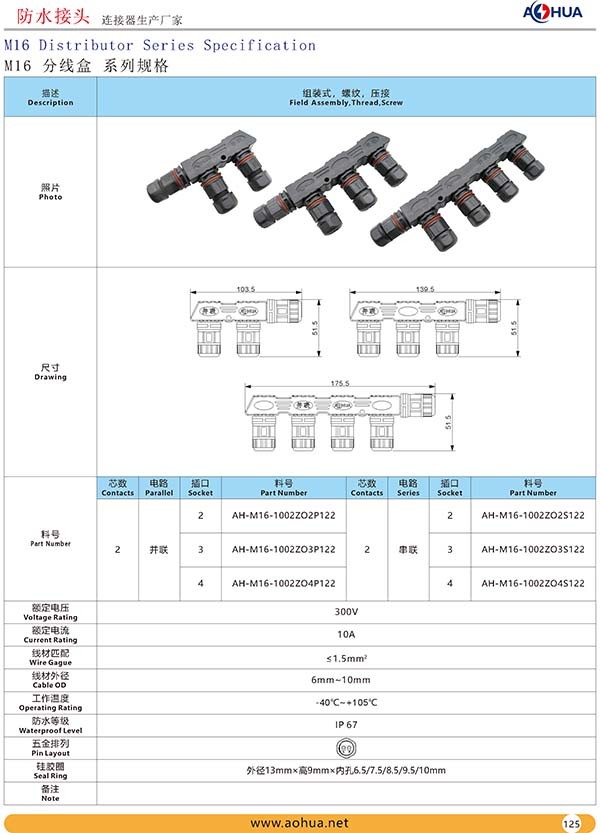 AHUA澳華公司專業(yè)生產(chǎn)LED防水插頭連接器、路燈模組分線盒、工控防水公母接頭、光伏航空插頭、新能源防水電源連接線、植物生長燈連接線、畜牧養(yǎng)殖連接線、汽車線束。工廠自有模具制造、電線電纜押出、大型注塑、五金制造,雙生產(chǎn)基地,可來圖來樣個性化定制,國家高新技術(shù)規(guī)模企業(yè)!